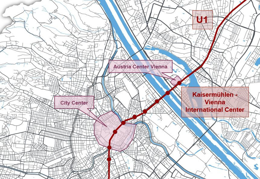 The first option allows you to walk to the conference, but you will not find any options for dinner or drinks in the evening near the convention center. The second option allows you to stay close to the main sights and find many restaurant and bar options, but you will have to take the subway to get to the conference. The Austria Center Vienna is next to the U1 subway station “Kaisermühlen - Vienna International Center”. So, when searching for a hotel near the city center, it is highly recommended that you pick one that is close to a U1 subway station (or any other subway line that directly connects to U1).